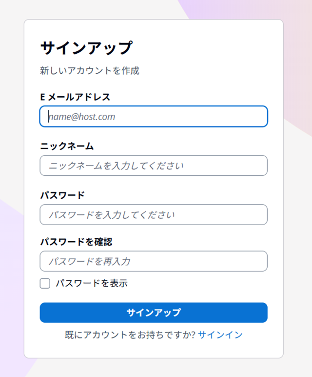 - サインアップ画面では、確実に受信可能な"あなたのメールアドレス"とニックネーム、パスワードを入力し、「サインアップ」を押してください。